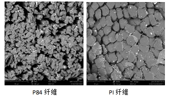 (一)微觀截面:P84纖維,最為人所知的就是它的三葉型截面,因此具有比較大的比表面積,過濾效果好。而PI纖維截面大多呈圓形。